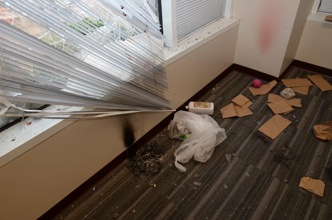 At the violent direct action, several rioters climbed over the security fence and hurled rocks, cinder blocks, modified explosive fireworks and Molotov cocktails at the building.