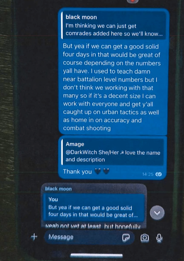 Prosecutors released screenshots from the cell’s Signal chat. ‘DarkWitch She/Her’ is allegedly Micah Legnon