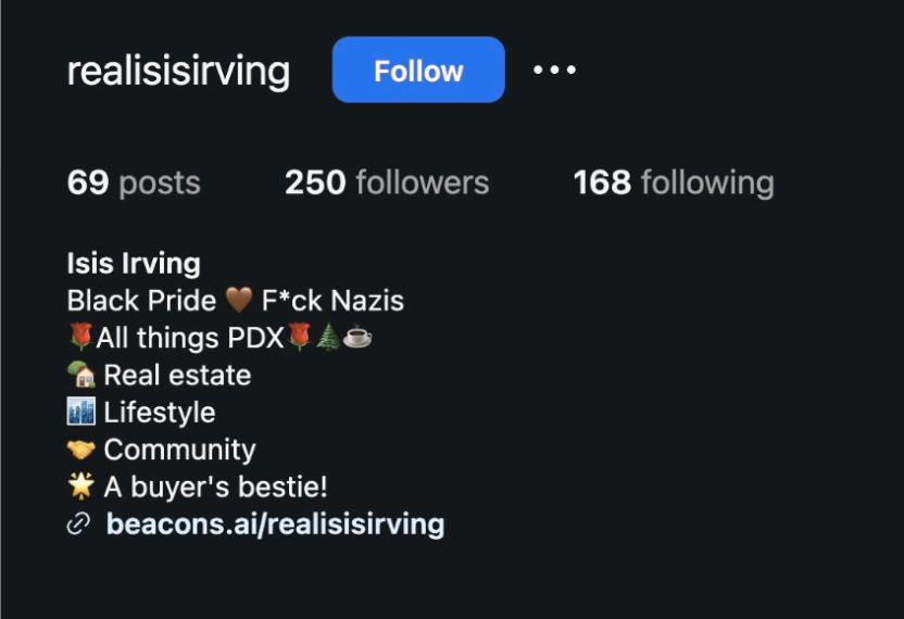 Irving’s Instagram and TikTok profiles read: “Black Pride. F— Nazis.” She did not respond to multiple requests for comment.