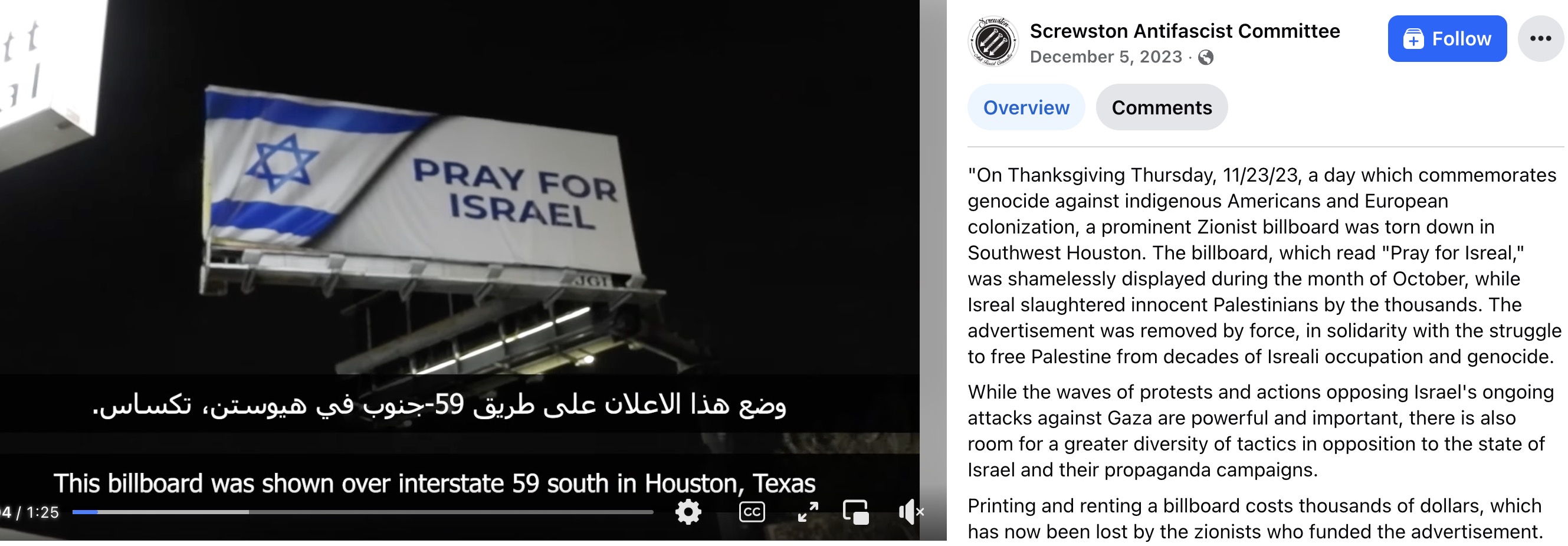 Screwston Antifa previously posted a claim of responsibility for vandalizing a billboard shortly after the Oct. 7, 2023 terror attacks in Israel