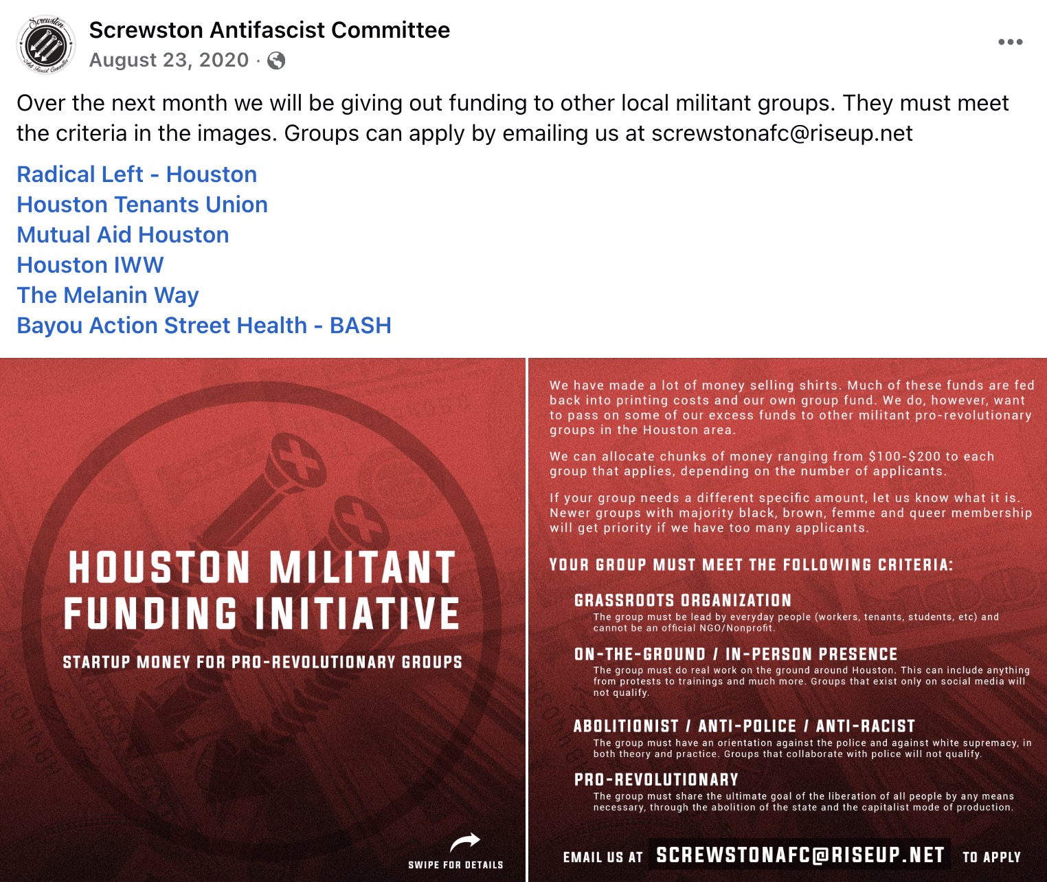 Screwston Antifa had previously been open about financially backing extremist militant “startups.”