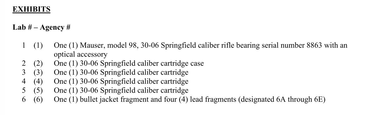Exhibits include: One Mauser, model 98, 30-06 Springfield caliber rifle bearing serial number 8863 with an optical accessory; One 30-06 Springfield caliber cartridge case; One 30-06 Springfield caliber cartridge; One 30-06 Springfield caliber cartridge; One 30-06 Springfield caliber cartridge; One bullet jacket fragment and four lead fragments.