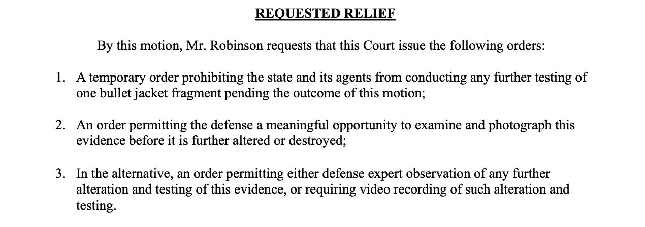 Robinson's attorneys state that they "inquired of the state via email whether the FBI laboratory was open to having a defense expert present during the FBI's preparation and examination of the bullet fragment, and, if not, whether the laboratory was willing to video that process." In response, the FBI said the agency has "policies, which will not change for this case, do not allow a defense examiner to be present or video taping of the examination."