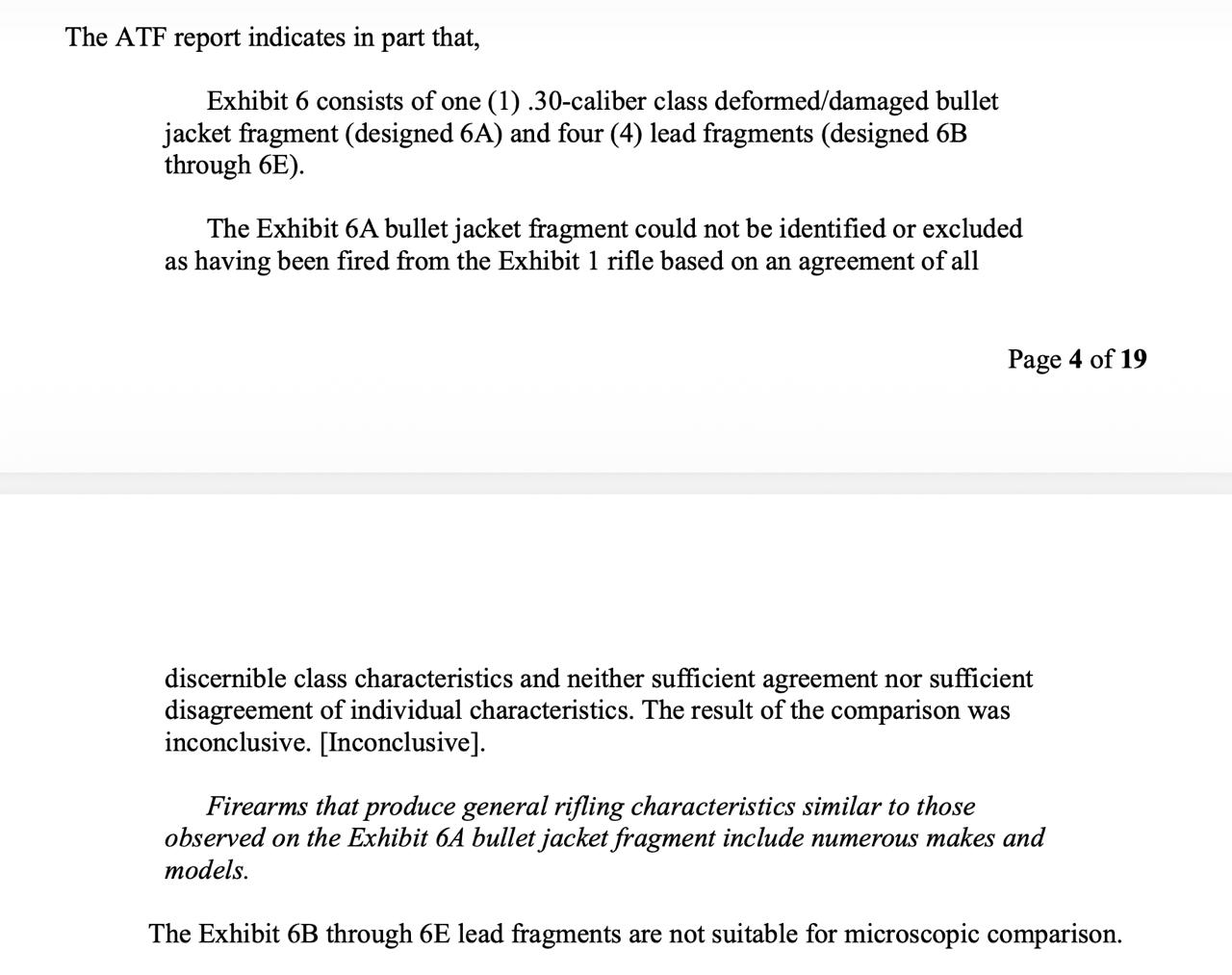 The report states that the "bullet jacket fragment could not be identified or excluded as having been fired from the Exhibit 1 rifle based on an agreement of all discernible class characteristics and neither sufficient agreement nor sufficient disagreement of individual characteristics. The result of the comparison was inconclusive." The lead fragments, the report states, "are not suitable for microscopic comparison."
