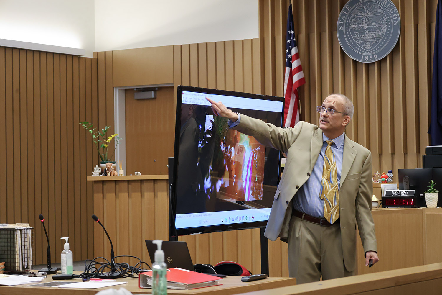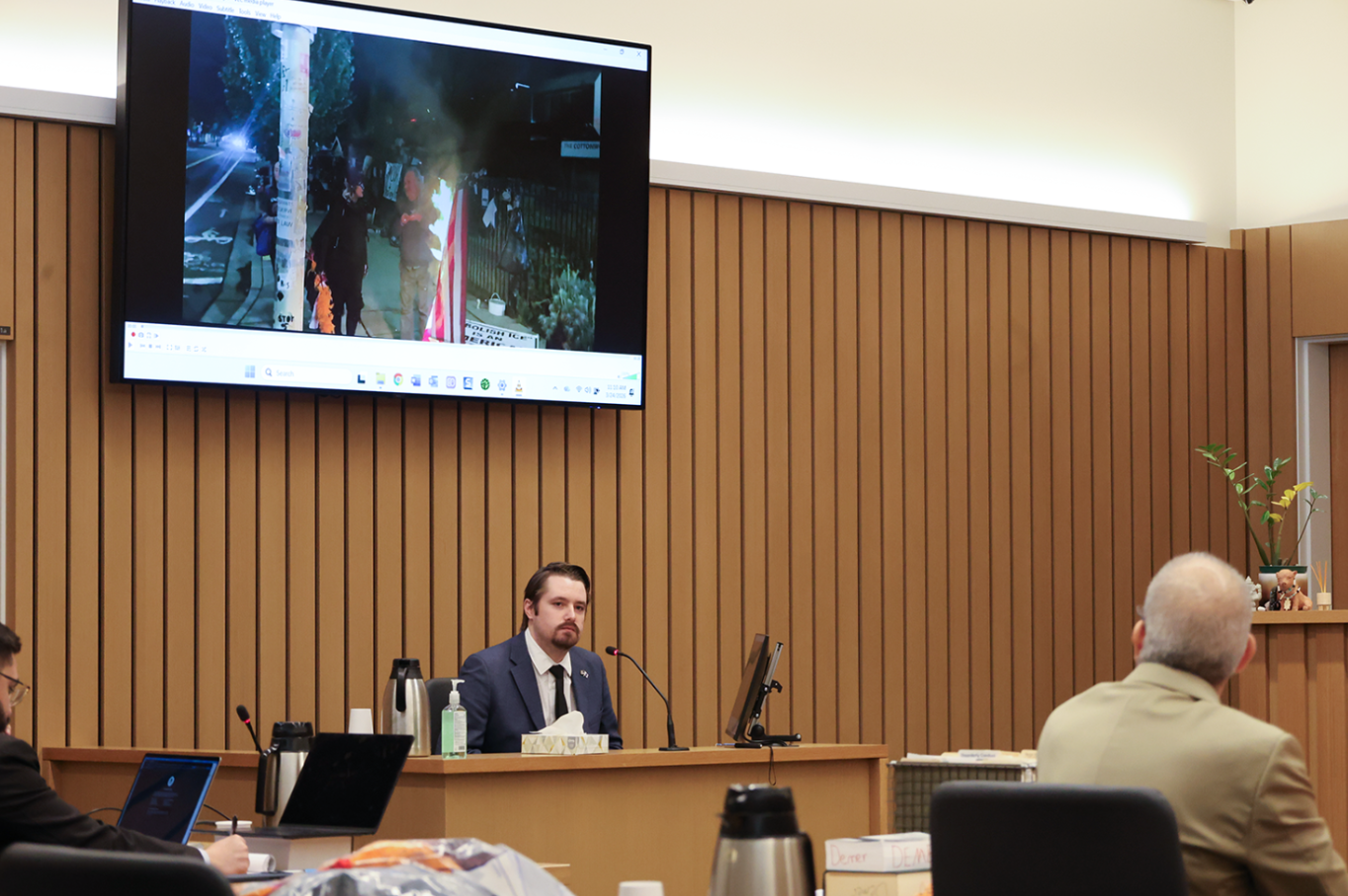 “Evidence is going to show you two different crimes,” Senior Deputy District Attorney Kevin Demer said in opening statements, arguing Davis “aggressively pursued” Sortor after he extinguished an American flag that had been set on fire during anti-ICE unrest.