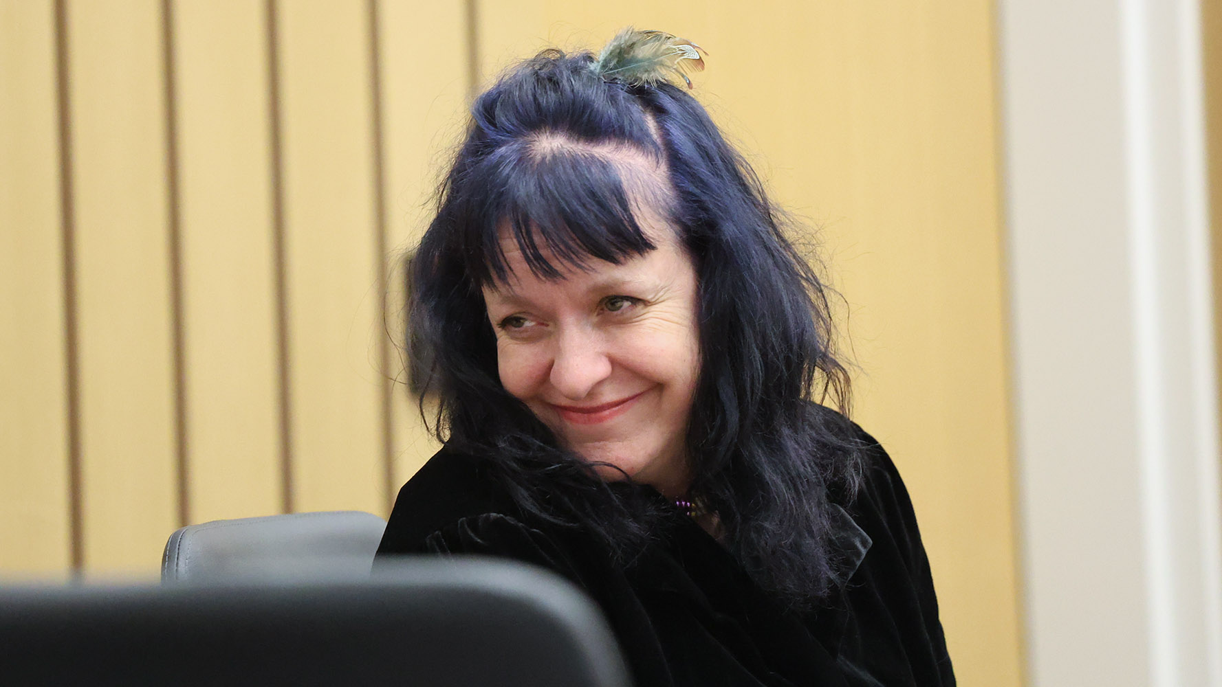 Defendant Angella Davis wore a bird-themed black costume to hide her identity