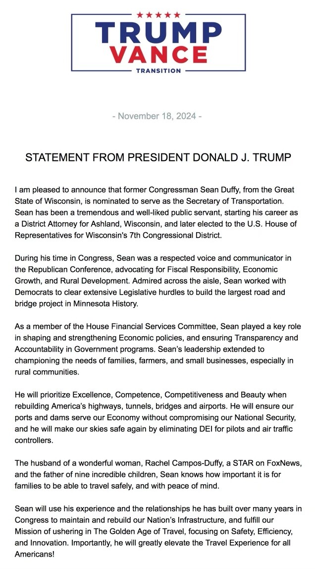Trump wrote that Duffy will "prioritize Excellence, Competence, Competitiveness and Beauty when rebuilding America’s highways, tunnels, bridges and airports" and will "ensure our ports and dams serve our Economy without compromising our National Security, and he will make our skies safe again by eliminating DEI for pilots and air traffic controllers."