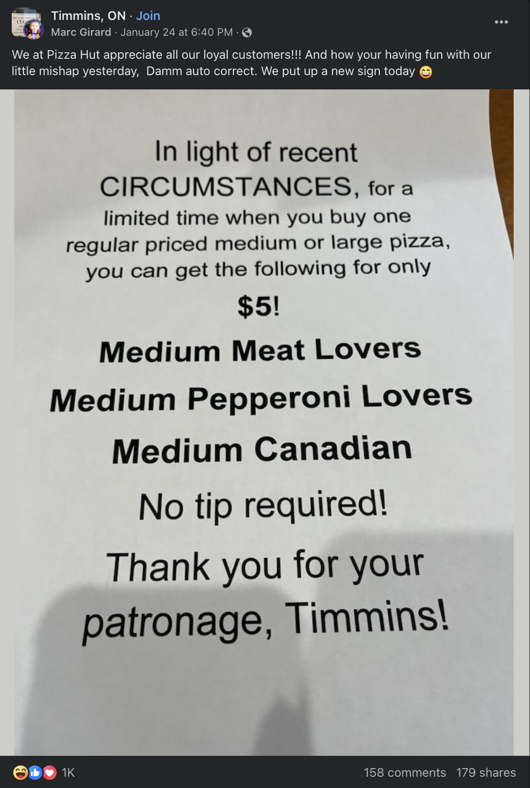 A Pizza Hut in the small northern Ontario community of Timmins has gone viral after locals spotted what was almost certainly a typo on a notice posted to the front door.