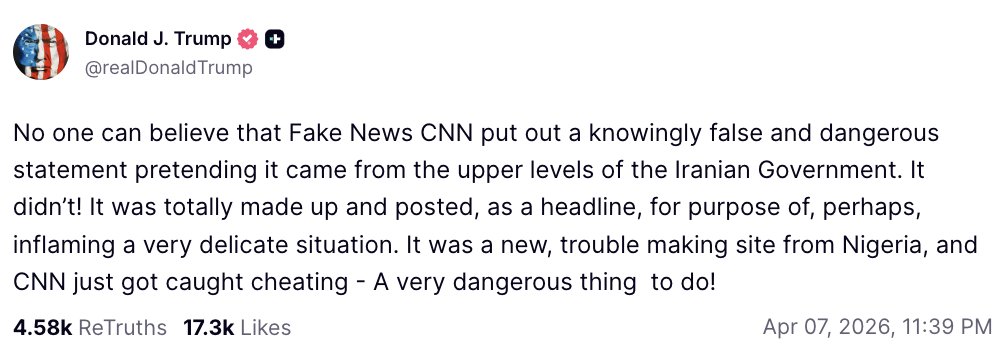 Trump later wrote, "No one can believe that Fake News CNN put out a knowingly false and dangerous statement pretending it came from the upper levels of the Iranian Government. It didn’t! It was totally made up and posted, as a headline, for the purpose of, perhaps, inflaming a very delicate situation. it was a new, trouble making site from Nigeria, and CNN just got caught cheating - A very dangerous thing to do!"