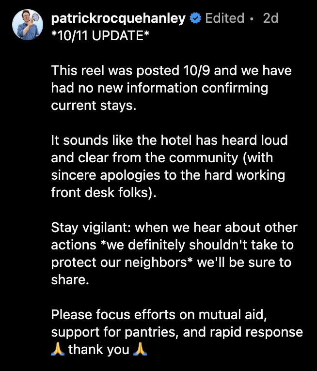 Hanley wrote in an update a few days after posting the video to Instagram, "This reel was posted 10/9 and we have had no new information confirming current stays. It sounds like the hotel has heard loud and clear from the community (with sincere apologies to the hard working front desk folks). Stay vigilant: when we hear about other actions *we definitely shouldn't take to protect our neighbors* we'll be sure to share. Please focus efforts on mutual aid, support for pantries, and rapid response."