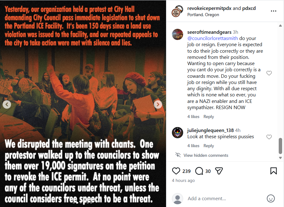 She demanded that the city take extra precautions to protect councilors from anti-ICE extremists, who are now targeting Smith for speaking out against their violence and intimidation. "Revoke ICE Permit PDX" lambasted Smith for feeling the need to protect herself in a social media post, resulting in the extremist group's supporters threatening Smith. One user wrote in the comments, "Guns won't keep you safe."