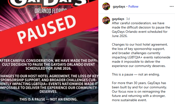 “After careful consideration, we have made the difficult decision to pause the GayDays Orlando event scheduled for June 2026. Changes to our host hotel agreement, the loss of key sponsorship support, and broader challenges currently impacting LGBTQIA+ events nationwide made it impossible to deliver the experience our community deserves. This is a pause — not an ending. For more than 30 years, GayDays has been built by and for our community. Our focus now is on reimagining the future and returning with a stronger, more sustainable event,” the event organizers said in a post to Instagram.