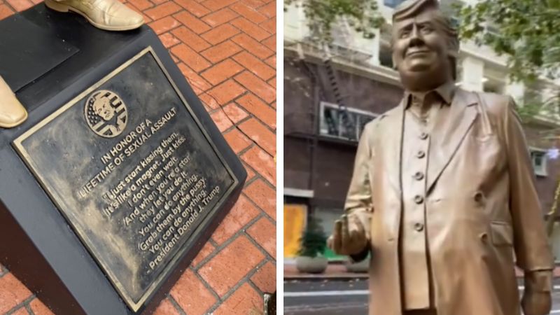 The plaque headline read: "In honor of a lifetime of sexual assault." It followed up with an unfavorable quote from Trump that was captured on a hot mic in 2005, where he discussed how women would throw themselves at him because of his wealth: "I just start kissing them. It's like a magnet. I don't even wait. And when you're a star, they just let you do it. You can do anything. Grab them by the pussy. You can do anything."