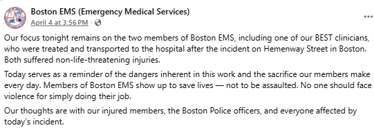 "Today serves as a reminder of the dangers inherent in this work and the sacrifice our members make every day. Members of Boston EMS show up to save lives — not to be assaulted. No one should face violence for simply doing their job. Our thoughts are with our injured members, the Boston Police officers, and everyone affected by today’s incident."