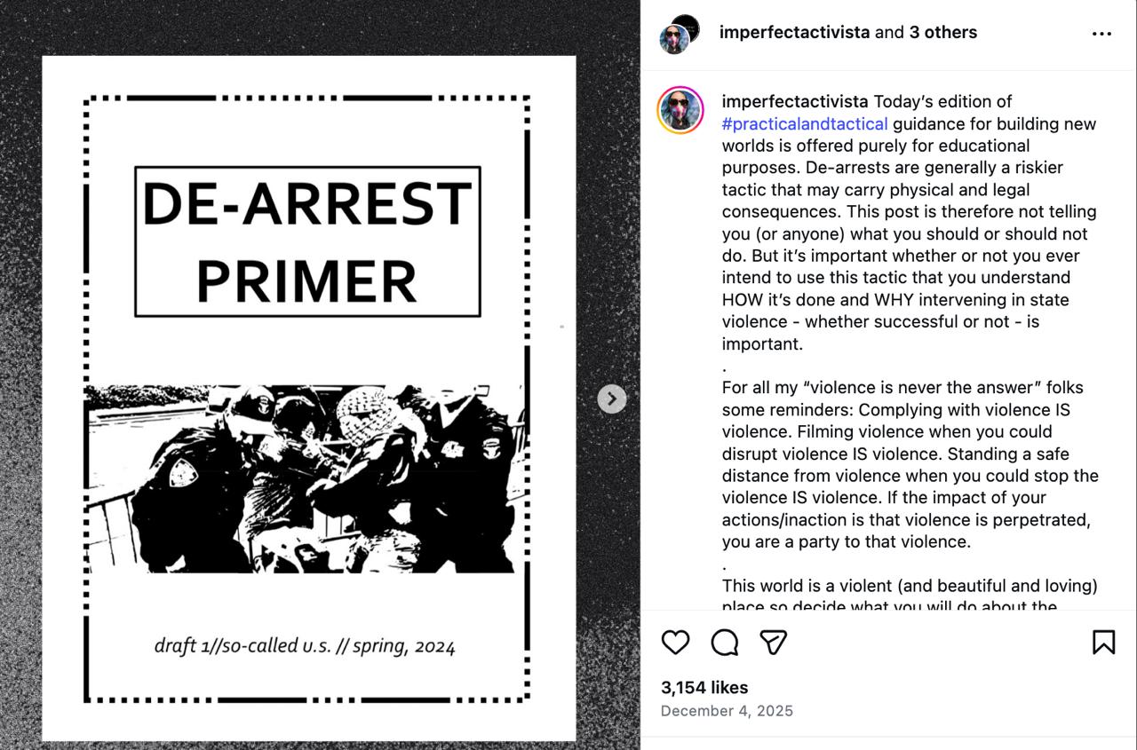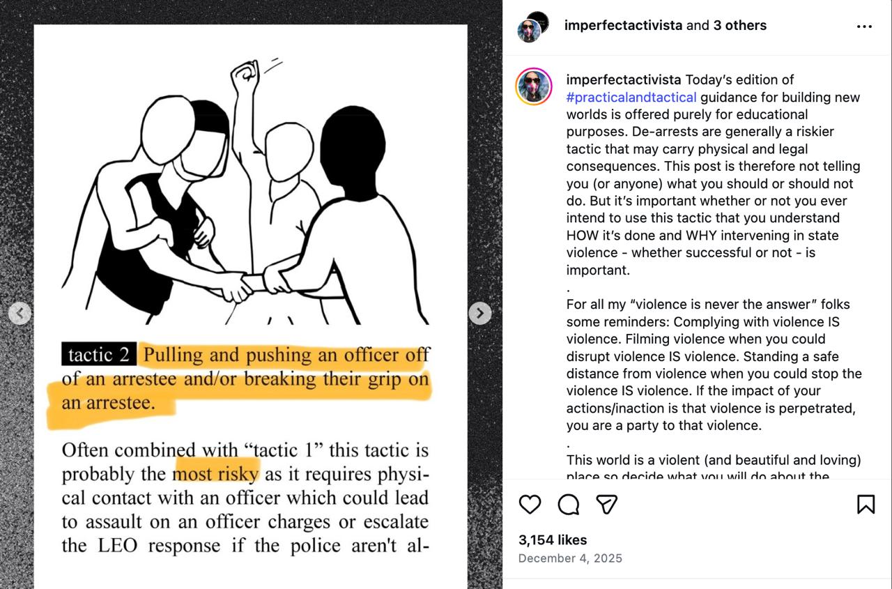 The tactics included in the "de-arrest" zine instructs agitators to directly disobey law enforcement and while the caution on the post reads, "De-arrests are generally a riskier tactic that may carry physical and legal consequences." It goes on to say, "This post is therefore not telling you (or anyone) what you should or should not do. But it’s important whether or not you ever intend to use this tactic that you understand HOW it’s done and WHY intervening in state violence - whether successful or not - is important."