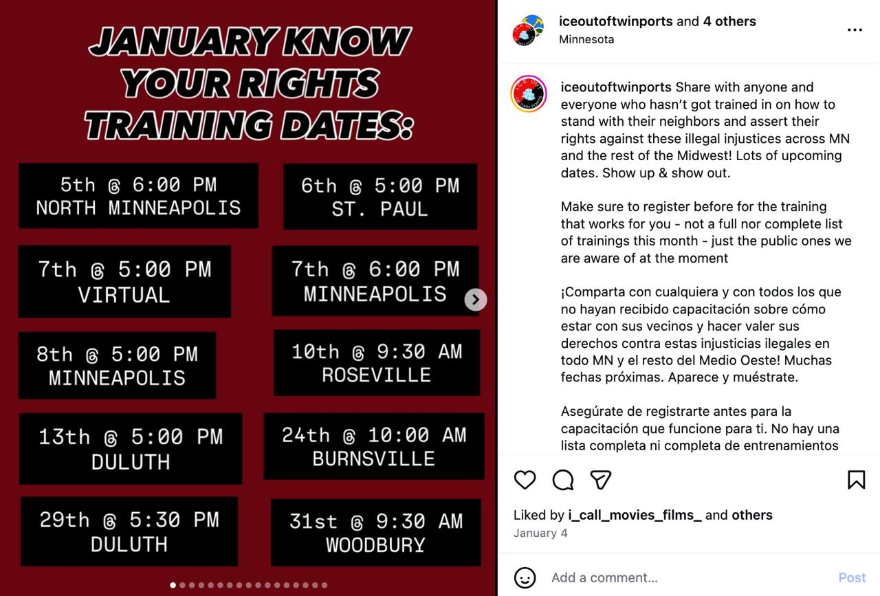 ICE Watch held trainings in Minneapolis and St. Paul in the days leading up to the protest where Brown lost her life when she angled her car in the street to block law enforcement vehicles from driving down the street. She was shot by an ICE agent as she drove her car into him. She'd been told to get out of the car but did not comply.
