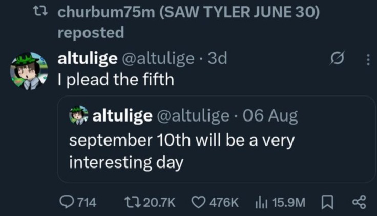 One post that said, "september 10th will be a very interesting day" that was made on August 6 was shared again by the user who posted saying, "I plead the fifth" when the assassination took place. However, that post was then shared by "churbum75m (SAW TYLER JUNE 30)," and also follows Twiggs with the account.