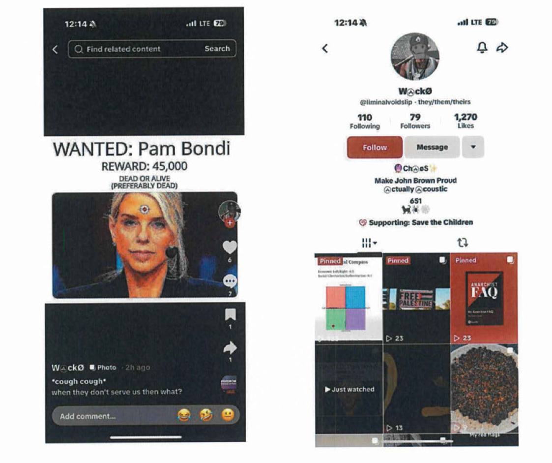 The post placing the bounty on Bondi was reported to authorities earlier this month. A post was flagged by a TikTok user in Detroit and it featured a "sniper-scope red dot" on her head. Text to the post read, "WANTED: Pam Bondi. REWARD: 45,000. DEAD OR ALIVE (PREFERABLY DEAD)," according to court documents in the case. The post was traced to Tyler Maxon Avalos, 30, who lives in St. Paul, Minnesota.