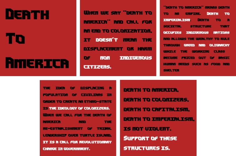 Another series of posts stated, "Death to America. When we say 'death to America' and call for an end to colonization, it doesn’t mean the displacement or harm of non Indigenous citizens. 'Death to America' means death to an empire. Death to imperialism. Death to a societal structure that occupies Indigenous nations and allows the wealthy to rule through greed and oligarch while the working class become priced out of basic human needs such as food and shelter.