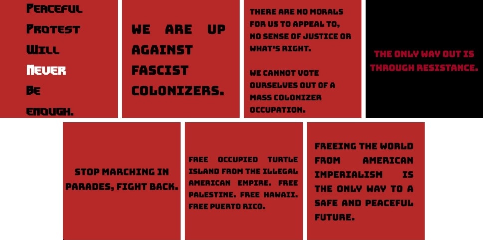 In one series of posts from September, the group states, "peaceful protest will never be enough. We are up against fascist colonizers. There are no morals for us to appeal to, no sense of justice or what’s right. We cannot vote ourselves our of a mass colonizer occupation. The only way out is through resistance. Stop marching in parades, fight back. Free occupied Turtle Island from the illegal American Empire. Free Palestine. Free Hawaii. Free Puerto Rico."