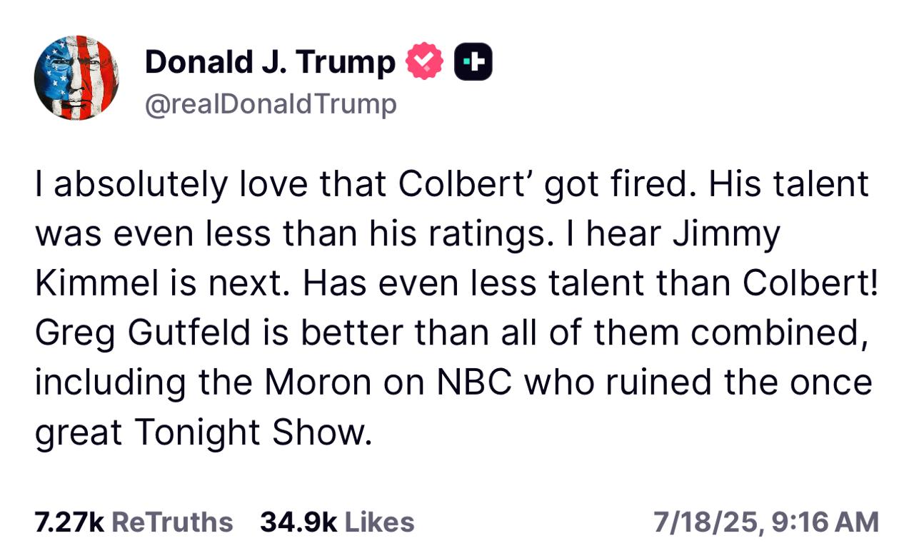 Colbert had his own, very similar take about the reason he's losing his position with CBS and his show. "I gotta say, it makes sense we'd be canceled, I get it guys, and thanks again, thanks to the network," he said before pulling up a Truth Social post from the president that read "I absolutely love that Colbert got fired. His talent was even less than his ratings. I hear Jimmy Kimmel is next. Has even less talent than Colbert! Greg Gutfeld is better than all of them combined, including the Moron on NBC who ruined the once great Tonight Show."