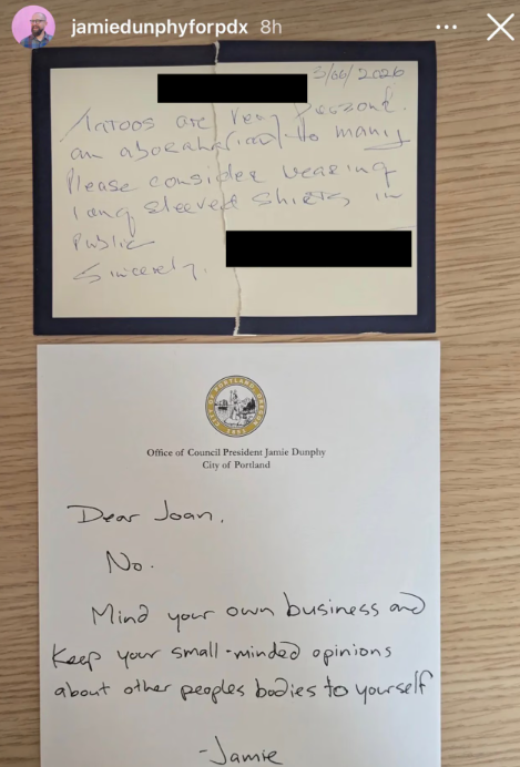 The 95-year-old, whose name is Joan, wrote to City Councilman Jamie Dunphy that tattoos can be "very personal" and can be a turnoff "to many people." She then suggested that he wear a long-sleeve shirt. “Please consider wearing long sleeved shirts in public,” the note read, which appeared to be torn in half after Dunphy posted an image of the note on his personal Instagram account.
