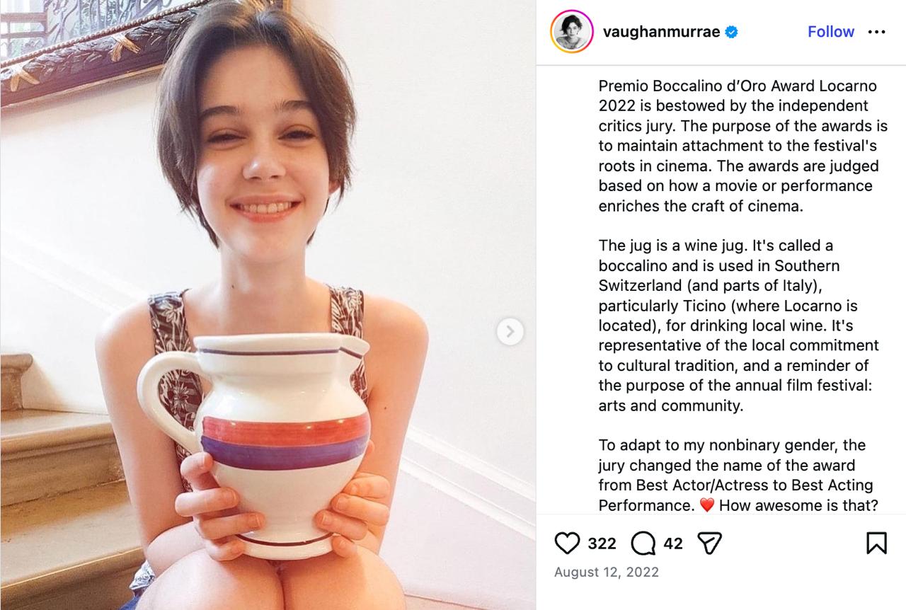 Murrae identifies as non-binary herself and made history as the first non-binary actor to be awarded the coveted Boccalino d'Oro prize at the Locarno Film Festival. She posted about it on her Instagram in 2022, saying "To adapt to my nonbinary gender, the jury changed the name of the award from Best Actor/Actress to Best Acting Performance. How awesome is that?"