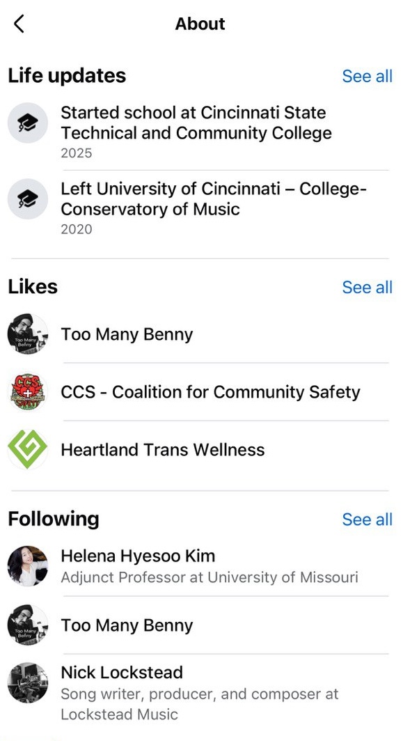 The Facebook account with the name "Julia DeFoor" has multiple liked pages, one of them including "Heartland Trans Wellness."