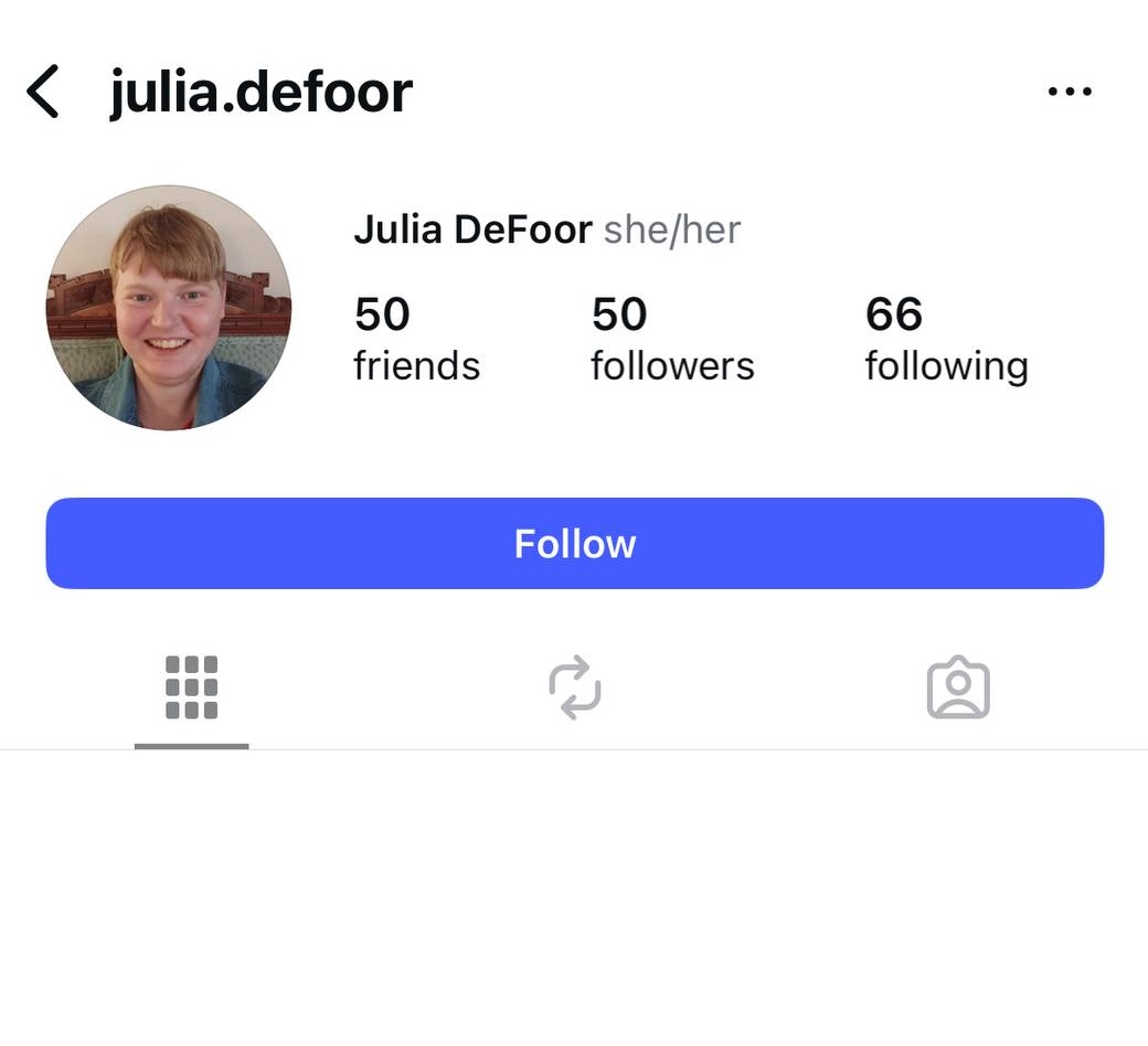 A Facebook profile shows a picture of DeFoor, but with the name "Julia." Additionally, an Instagram profile bearing the same name and likeness says "Julia DeFoor" goes by "she/her" pronouns.