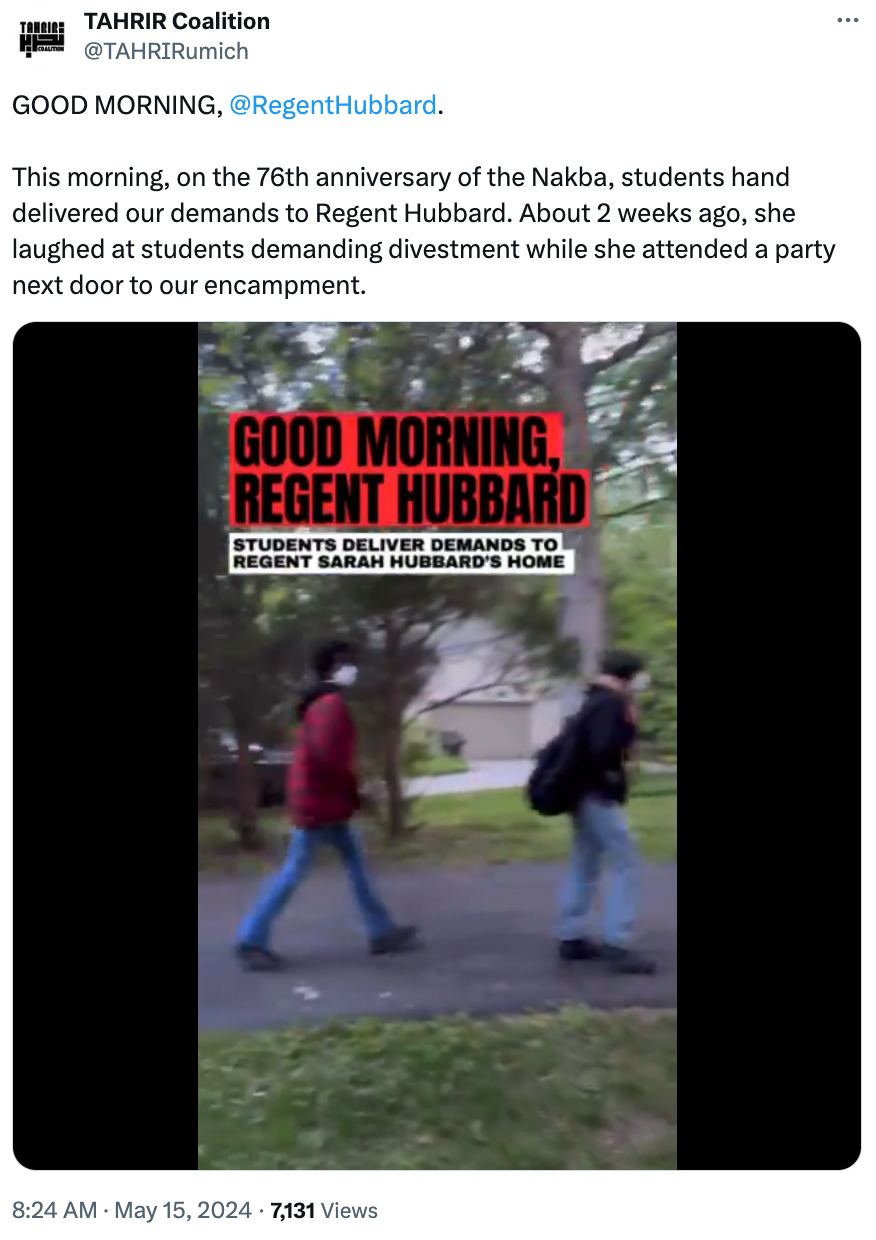 The agitators who came to the door during the confrontation hid their faces with masks, and those participating in the school's Gaza camp protest claimed responsibility on social media. "GOOD MORNING, [Regent Hubbard]," the Tahrir Coalition said. "This morning, on the 76th anniversary of the Nakba, students hand delivered our demands to Regent Hubbard. About 2 weeks ago, she laughed at students demanding divestment while she attended a party next door to our encampment."