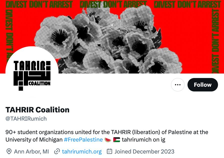 The Tahrir Coalition describes themselves as a “90+ student organizations united for the TAHRIR (liberation) of Palestine at the University of Michigan.”