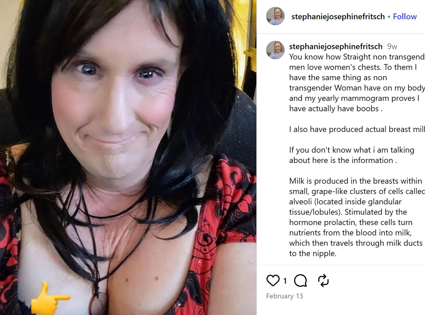 He also claims that existing as a transgender woman is a "statement" of "patriotism," and that he has produced milk from his chest. "You know how Straight non transgender men love women's chests. To them I have the same thing as non transgender Woman have on my body and my yearly mammogram proves I have actually have boobs," he said in an Instagram post.