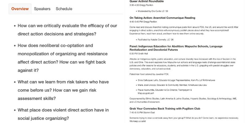 Event panels include a Queer Activist Roundtable; Anarchist Communique Readings, where individuals will read and analyze Antifa blog posts that have issued claims of responsibility for attacks committed and how to gain inspiration from them; and Grab Your Comrades Back Training, which teaches how to interfere with lawful police arrests in order to de-arrest their targeted comrades.