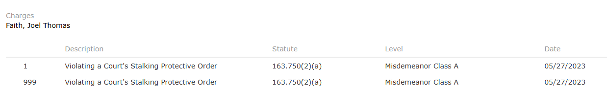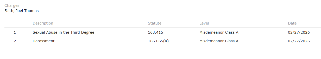 Faith has been charged with third-degree sexual abuse and harassment, both misdemeanors. Court records show that Faith had an active warrant for his arrest after being accused of violating a stalking protective order in 2023. The warrant was issued in July 2025, according to court documents.