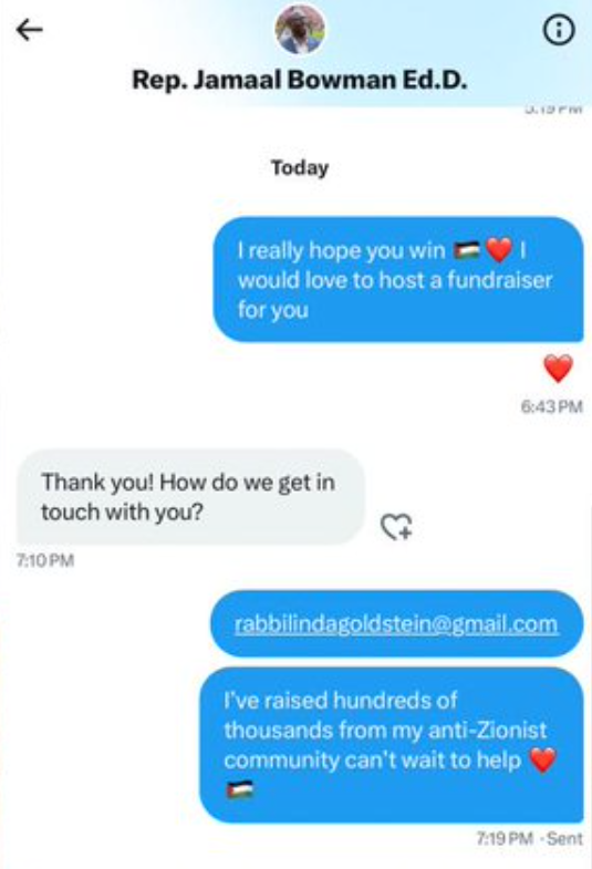 In a private message exchange, "Rabbi Linda Goldstein" expressed support for Bowman's campaign, to which the representative responded enthusiastically, expressing interest in hosting a fundraiser.