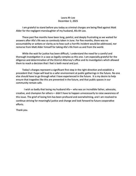 “For five months, there had not yet been any accountability for actions or clarity as to how such a horrific incident would be addressed, nor remorse from Matt Alder himself for taking Afa’s life from us and from the world,” she said. “Today’s charges represent a significant first step in the right direction and establish a precedent that I hope will lead to a safer environment at public gatherings in the future. No one else should have to go through what I have experienced in the future.”