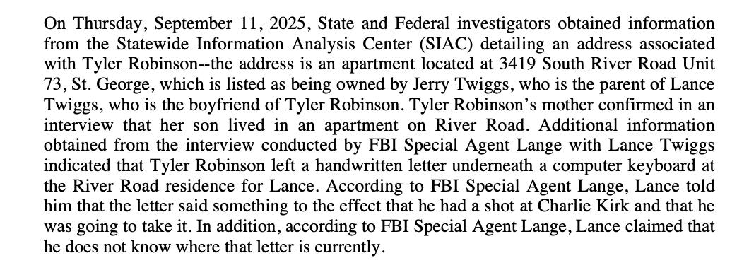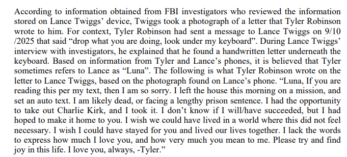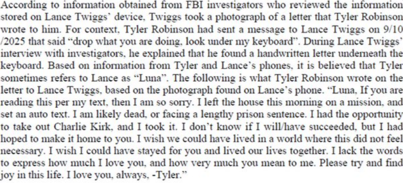 "Luna, if you are reading this per my text, then I am so sorry. I left the house this morning on a mission, and sent an auto text. I am likely dead or facing a lengthy prison sentence. I had the opportunity to take out Charlie Kirk, and I took it," Robinson stated in the letter, per the warrant.