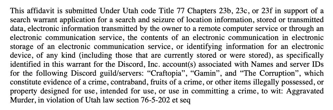 In a recently disclosed affidavit to obtain a search warrant, it was revealed that SBI requested that Discord provide "names and server IDs" from servers with names "Craftopia," "Gamin," as well as "The Corruption."