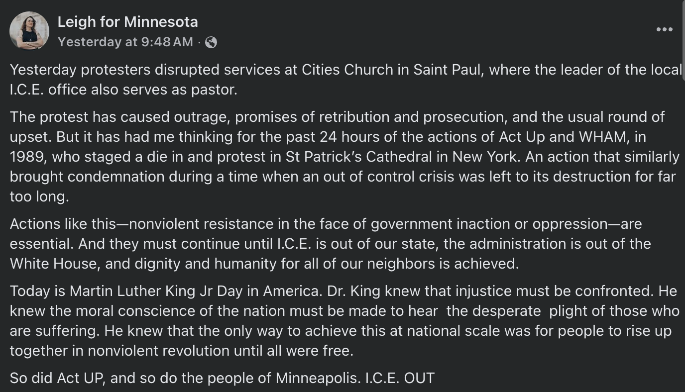 Dem Rep Leigh Finke wrote on Facebook, "Yesterday protesters disrupted services at Cities Church in Saint Paul, where the leader of the local ICE office also serves as pastor. The protest has caused outrage, promises of retribution and prosecution, and the usual round of upset. But it has had me thinking for the past 24 hours of the actions of Act Up and WHAM, in 1989, who staged a die in and protest in St Patrick’s Cathedral in New York. An action that similarly brought condemnation during a time when an out of control crisis was left to its destruction for far too long.