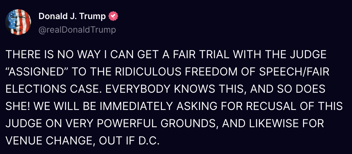 "There is no way I can get a fair trial with the judge 'assigned' to the ridiculous freedom of speech/fair elections case," Trump wrote on Truth Social on Sunday evening.