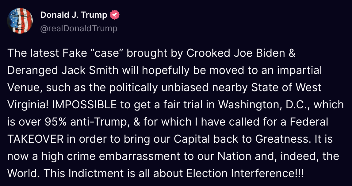 He wrote that it would be "impossible" to get a fair trial in DC, "which is over 95% anti-Trump, and for which I have called for a federal takeover in order to bring our Capital back to greatness."