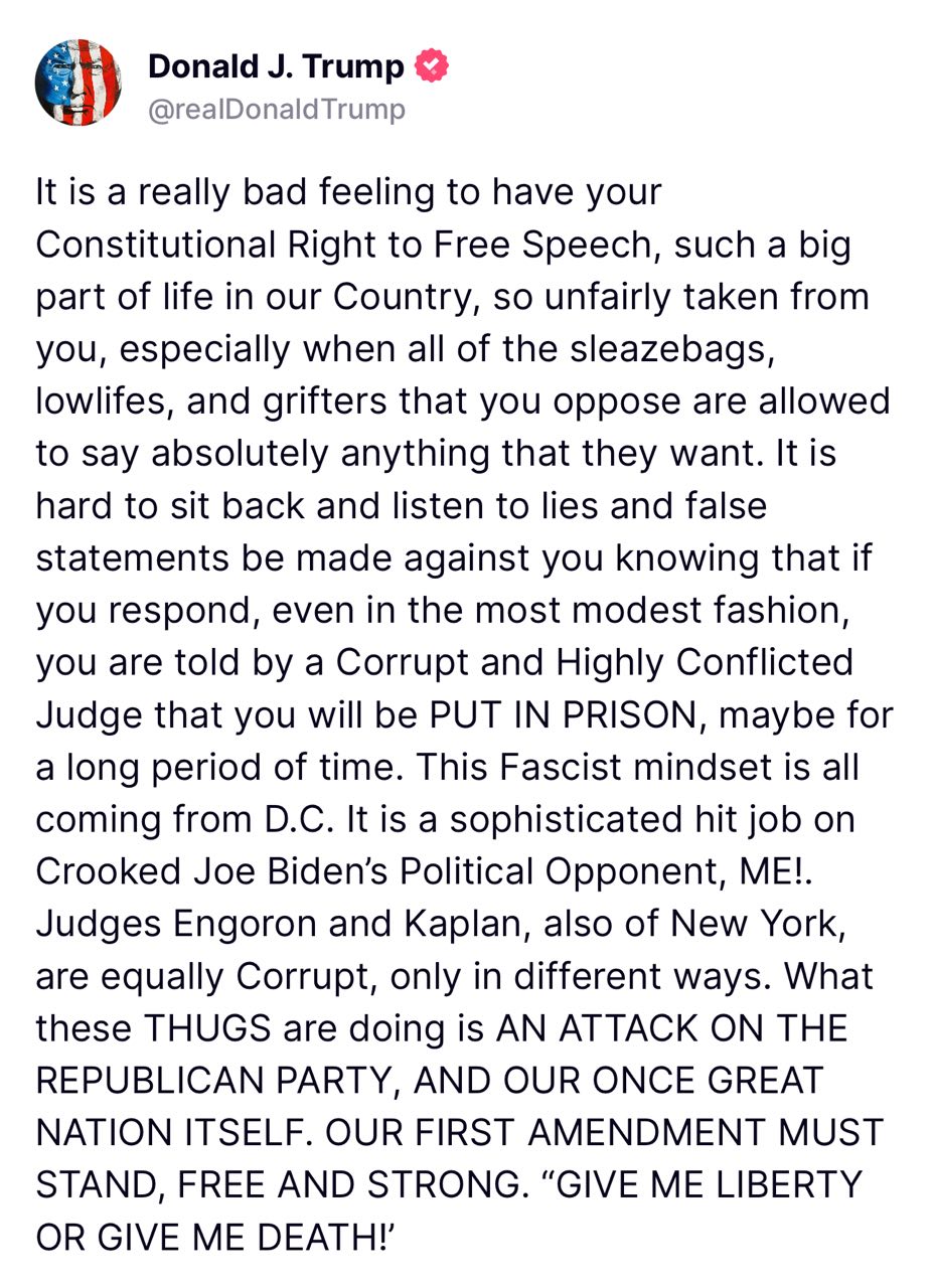 "This Fascist mindset is all coming from DC It is a sophisticated hit job on Crooked Joe Biden’s Political Opponent, ME!. Judges Engoron and Kaplan, also of New York, are equally Corrupt, only in different ways.