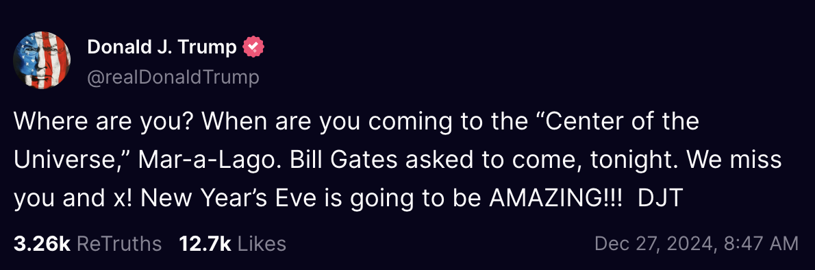 "Where are you? When are you coming to the 'Center of the Universe,' Mar-a-Lago. Bill Gates asked to come, tonight. We miss you and x! New Year’s Eve is going to be AMAZING!!! DJT," Trump wrote.
