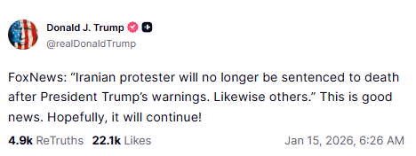 On Thursday, Trump wrote on Truth Social, "FoxNews: 'Iranian protester will no longer be sentenced to death after President Trump’s warnings. Likewise others.' This is good news. Hopefully, it will continue!"