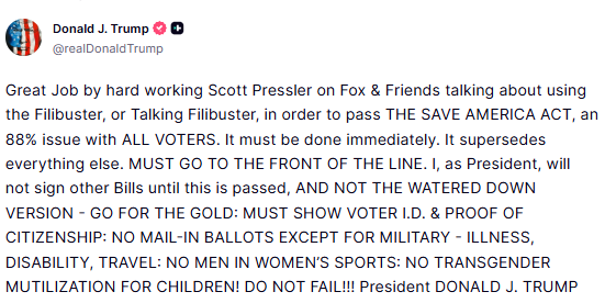 "I, as President, will not sign other Bills until this is passed, AND NOT THE WATERED DOWN VERSION - GO FOR THE GOLD: MUST SHOW VOTER I.D. & PROOF OF CITIZENSHIP: NO MAIL-IN BALLOTS EXCEPT FOR MILITARY - ILLNESS, DISABILITY, TRAVEL: NO MEN IN WOMEN’S SPORTS: NO TRANSGENDER MUTILIZATION FOR CHILDREN! DO NOT FAIL!!! President DONALD J. TRUMP," he added.