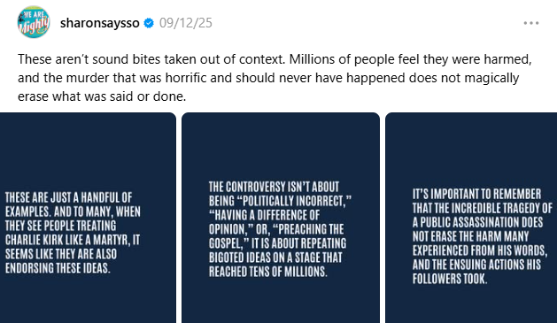 However, on September 12, just two days following Kirk's assassination, McMahon smeared Kirk with several quotes taken out of context in an attempt to characterize him as a racist with "bigoted ideas" that he spread "on a stage that reached tens of millions."