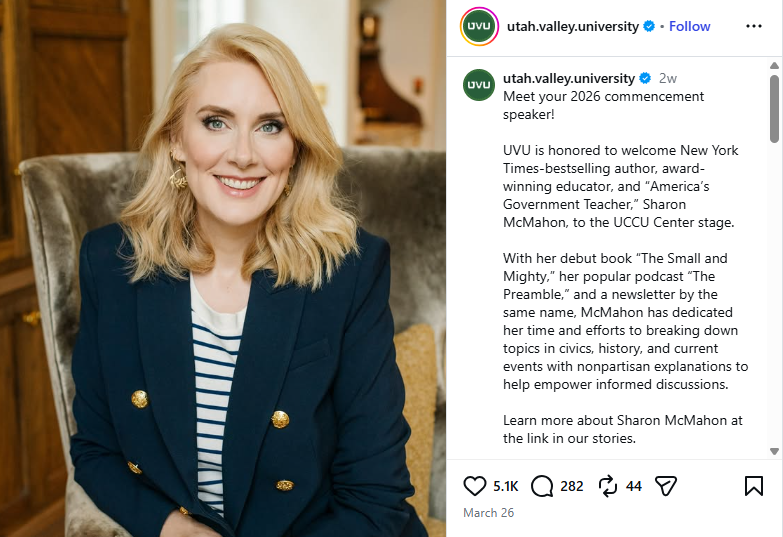 McMahon was praised by UVU in the March 26 announcement as someone who has "dedicated her time and efforts to breaking down topics in civics, history, and current events with nonpartisan explanations to help empower informed discussions."