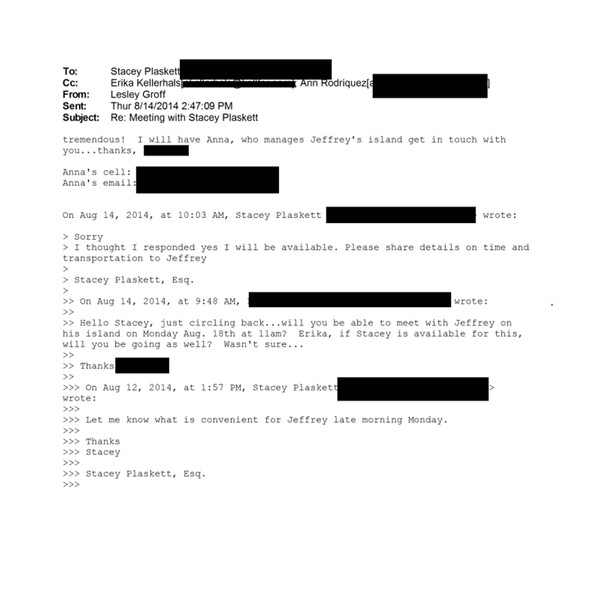 A 2014 email exchange between Plaskett and Epstein’s former executive assistant, Lesley Groff, reveals Plaskett accepted an invitation to the island.