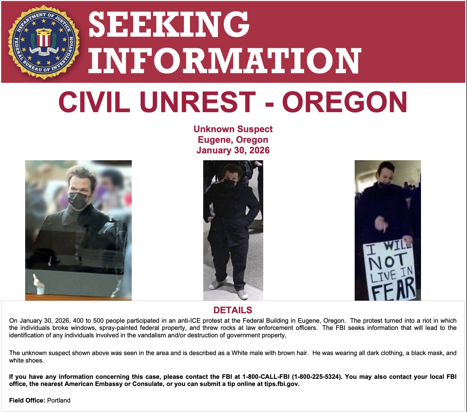 The FBI released a flyer of a wanted subject seen in the area that night. The individual is described as a white male with brown hair, wearing all dark clothing, a black mask, and white shoes.