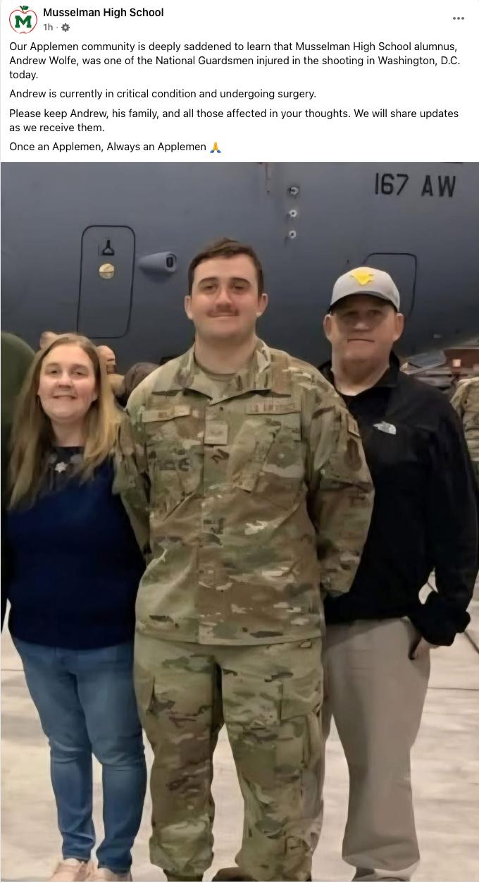 A post from Musselman High School in Inwood, West Virginia, identified one of the National Guard troops critically injured in an ambush attack on Wednesday as Andrew Wolfe. "Our Applemen community is deeply saddened to learn that Musselman High School alumnus, Andrew Wolfe, was one of the National Guardsmen injured in the shooting in Washington, D.C. today," read a post on the Musselman High School Facebook page.